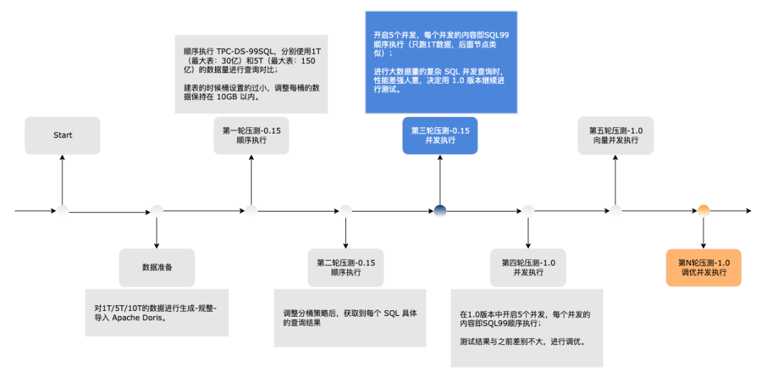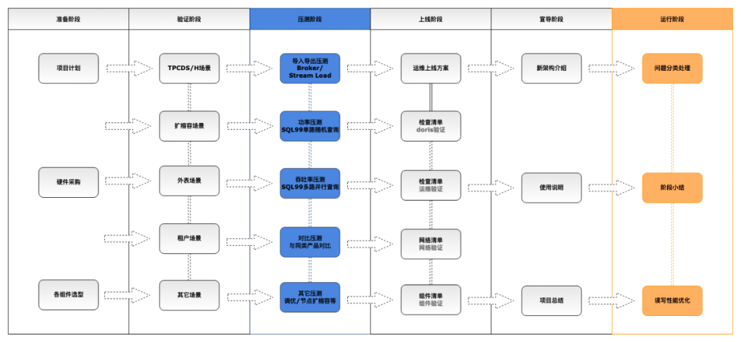 对于以 Apache Doris 为核心的新数据架构,我们规划了6个阶段进行运行测试,直至可以上线运行。(重点关注压测阶段和运行阶段,有一些调试优化经验分享给大家)