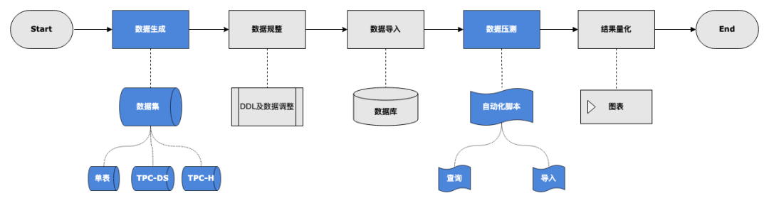 压测阶段首先进行数据生成,数据集选用的是 TPC-DS 数据,接着根据 Doris 的特性对 DDL 和 SQL 等规则进行对应调整,最后通过脚本将数据导入到 Apache Doris 存储中,再通过自动化脚本进行查询及导入压测,最终将压测结果输出到 MySQL 表中,量化为图表进行展示。下方为本阶段的基本配置及压测过程介绍: