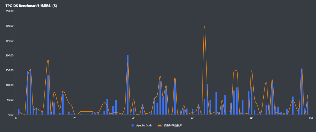 压测过程中,最初使用 0.15-release 版本进行测试,正巧 1.0-release 版本发布,后决定更换为 1.0-release 版本进行后续的压测。下图是基于 1T 的 TPC-DS 数据在同等硬件配置环境下和某商业 MPP 数据库的对比结果: