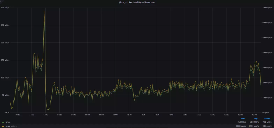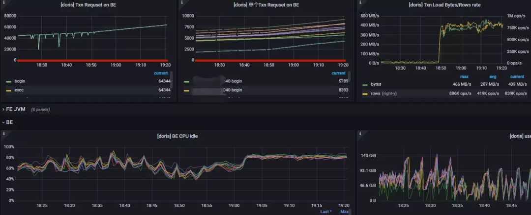 18:50 前将 Broker Load、insert into 和查询任务同时开启,18:50 后将 Stream Load 任务也开启(包括 80 bucket的表),集群整体的读写性能不仅没有下降,反而 Stream Load 时效突破了压测阶段的最大值 269 MB/S&680K ops/s,并且持续稳定。