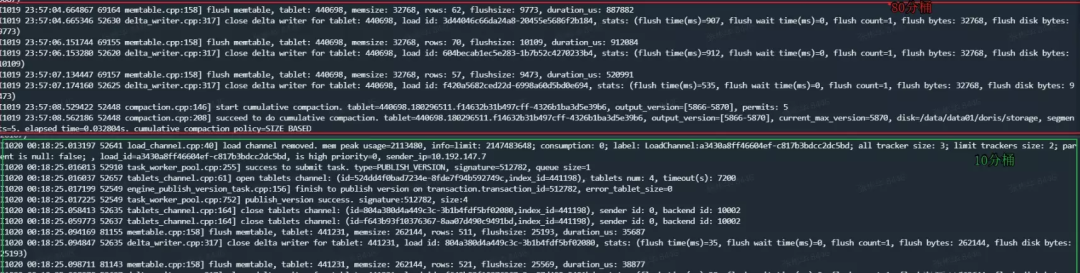 发现,80 个 Bucket 表写入某个 Tablet 的memsize/rows/flushsize/duration