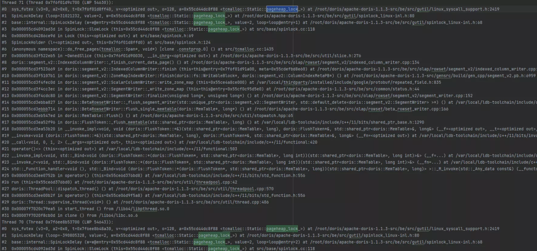 3. 同时收集 Pstack 日志,经过分析可以确定,Tcmalloc 在频繁地寻找 pageheap_lock