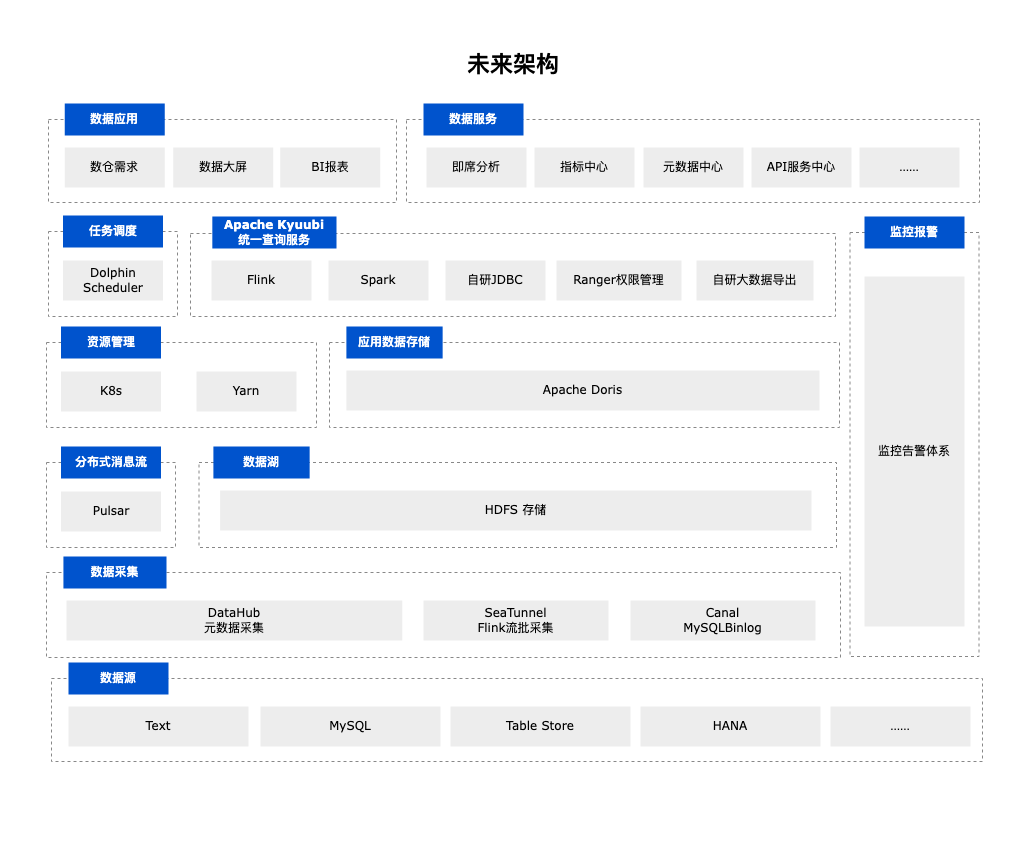 简化存储媒介,对 ClickHouse、Kudu、HBase 等技术栈进行收敛,由 Apache Doris 进行流批数据的统一存储