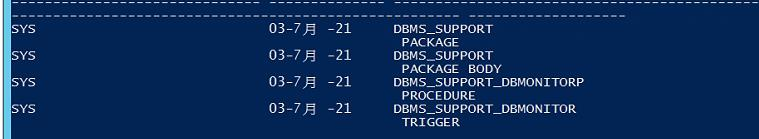 2.这个主要是使用被篡改的安装介质安装数据库后,数据库不会立马不能用,会在数据库内创建一个名为DBMS_SUPPORT_DBMONITORP的存储过程和名为DBMS_SUPPORT_DBMONITORP的触发器