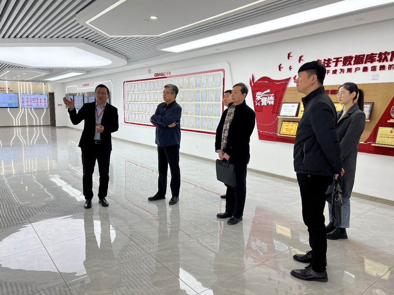 总工办热情引导信创海河实验室一行领导参观了企业展厅,详细介绍了GBASE专注国产数据库领域二十年的发展历程,汇报了企业在研发创新、市场应用、生态建设等方面的成果,龚克主任对GBASE近年来在数据库细分行业的发展和取得的重要成果表示赞许。