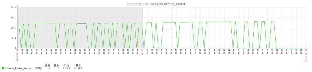 某天早上,正在搬砖,客户发来消息,反馈某个实例主从延时值反复在一万多到0之间来回跳动,如下: