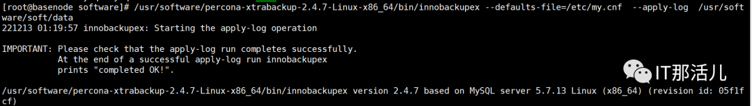 5.7.X版本 /usr/software/percona-xtrabackup-2.4.7-Linux-x86_64/bin/innobackupex --defaults-file=/etc/my.cnf --apply-log /usr/software/soft/data