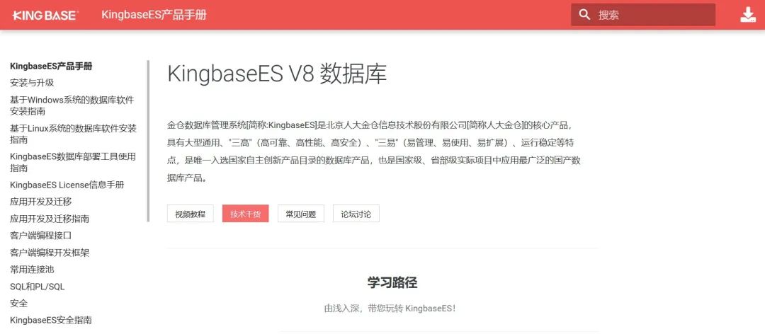KingbaseES数据库官方在线产品手册,从安装与升级、应用开发及迁移、安全、性能、可用性、系统管理等能力域,系统全面地讲解KingbaseES,支持全文在线搜索。