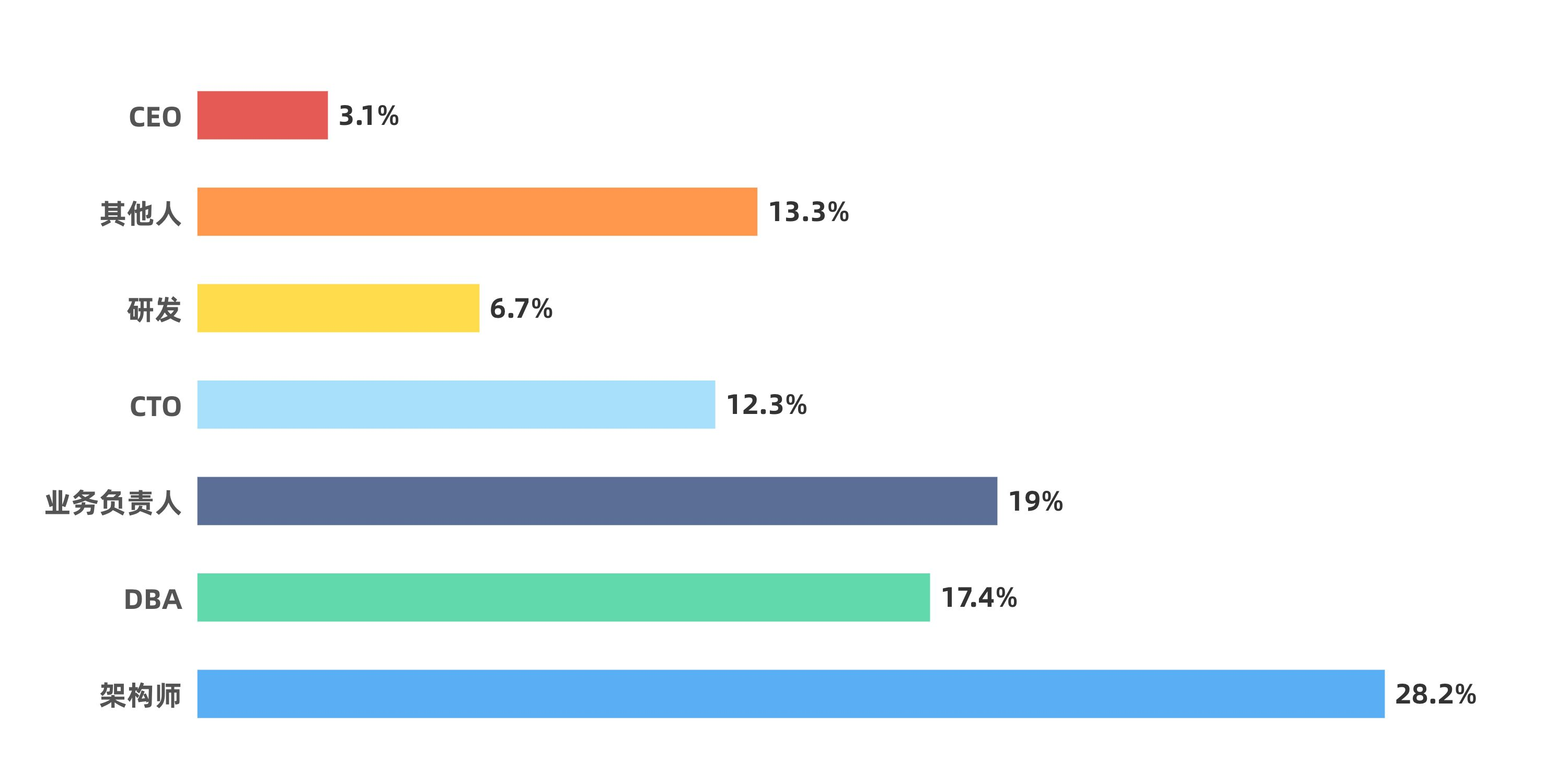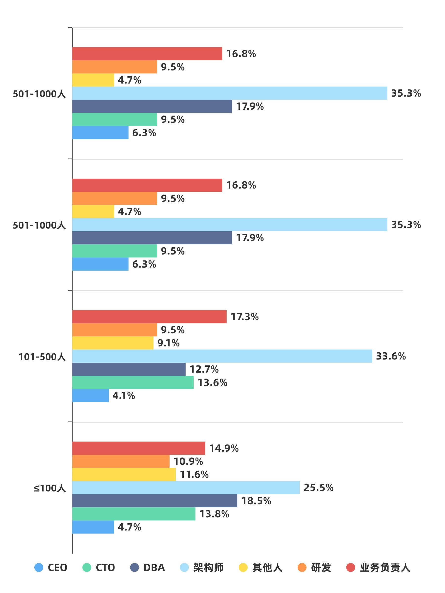 小于等于100人的企业,由架构师决定选型的占比25.5%,其次是DBA(18.5%)。大于1000人的企业,由架构师进行选型的相比于小微企业,比例增加了近1.5倍,占比40%。在不同的企业规模中,CEO都是较少对数据库技术和架构的选型进行决策的职位角色,皆仅占比不到7%。