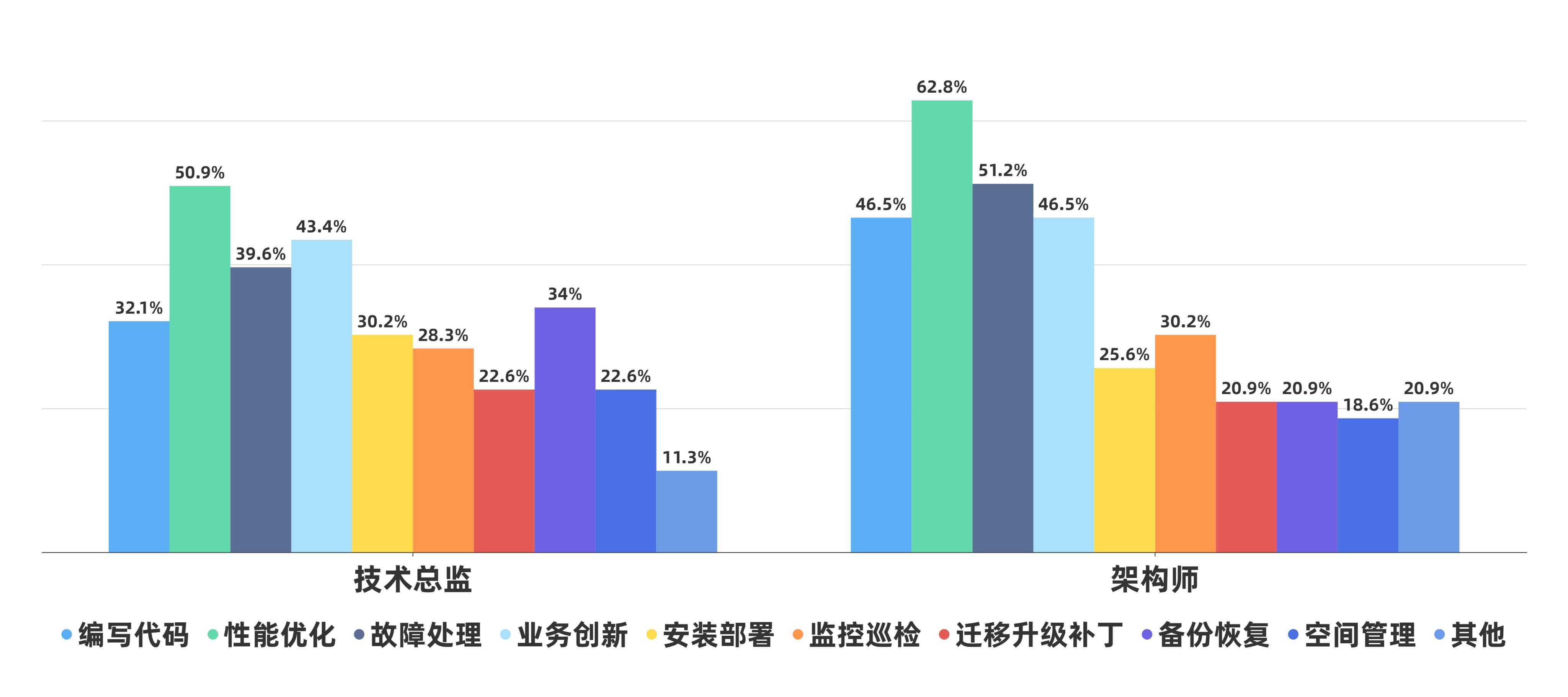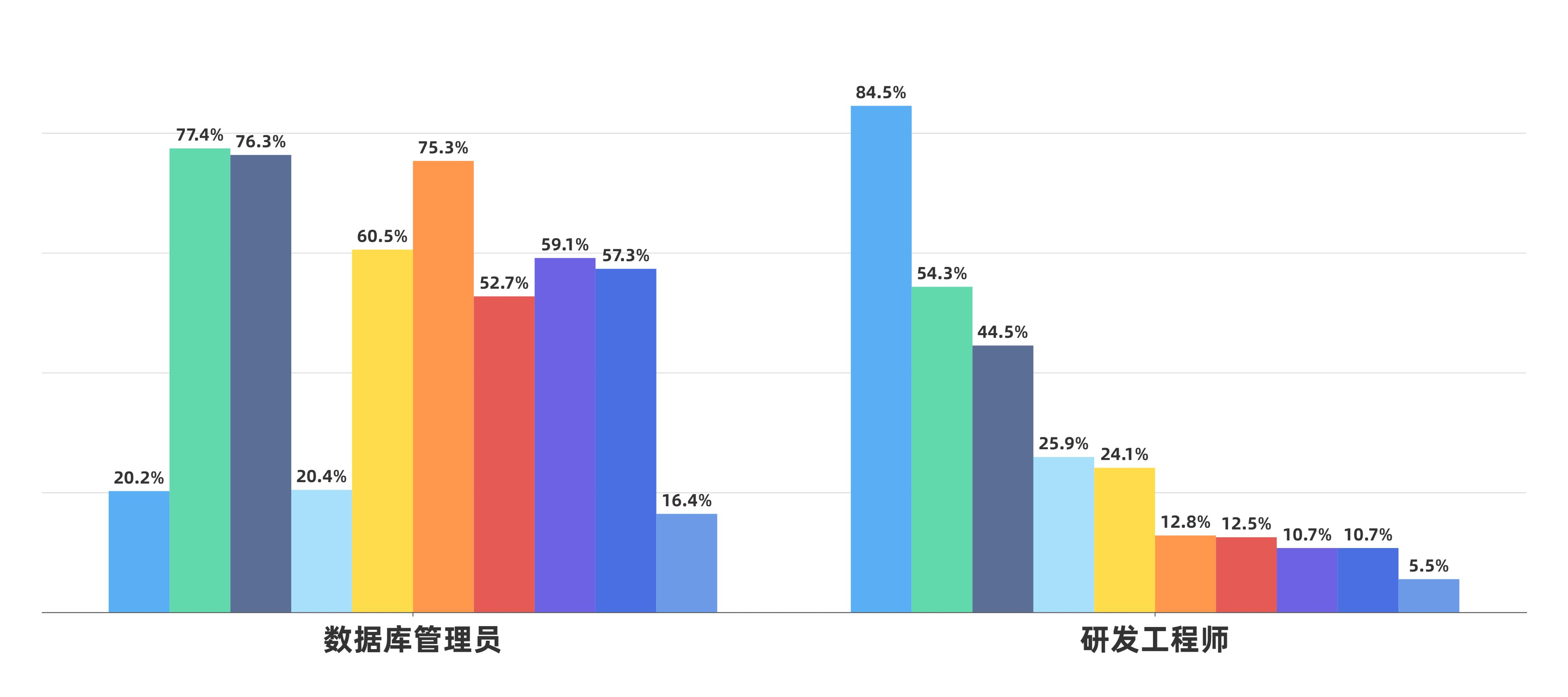 数据库管理员经常被性能优化、故障处理、监控巡检这三大事项困扰,分别占比77.4%、76.3%、75.3%,目前数据库管理员表示会在业务创新上只会花费20.4%的时间。这表明数据库管理员急需从以上三大事项中解放出来,从更高层次进行思考。相比其他职业,架构师在业务创新上花费的时间最多。
