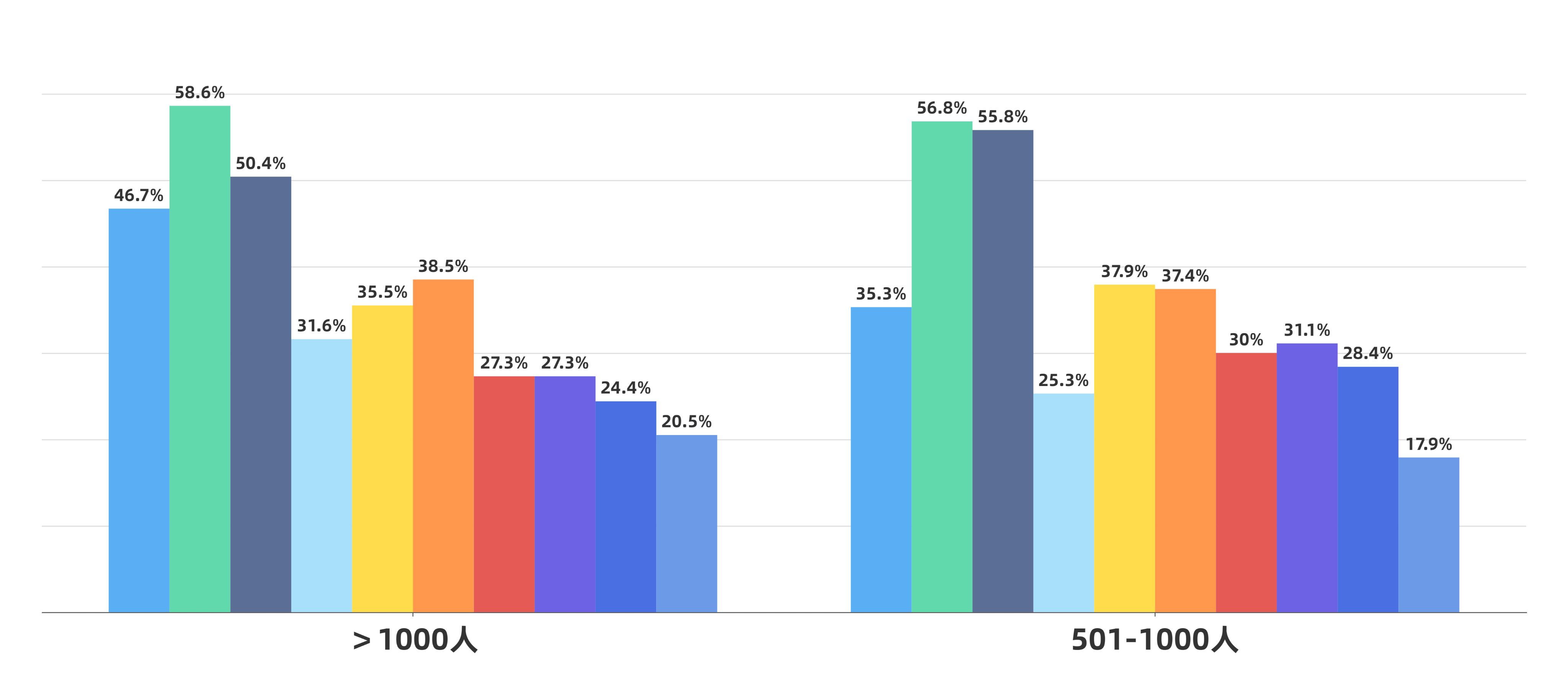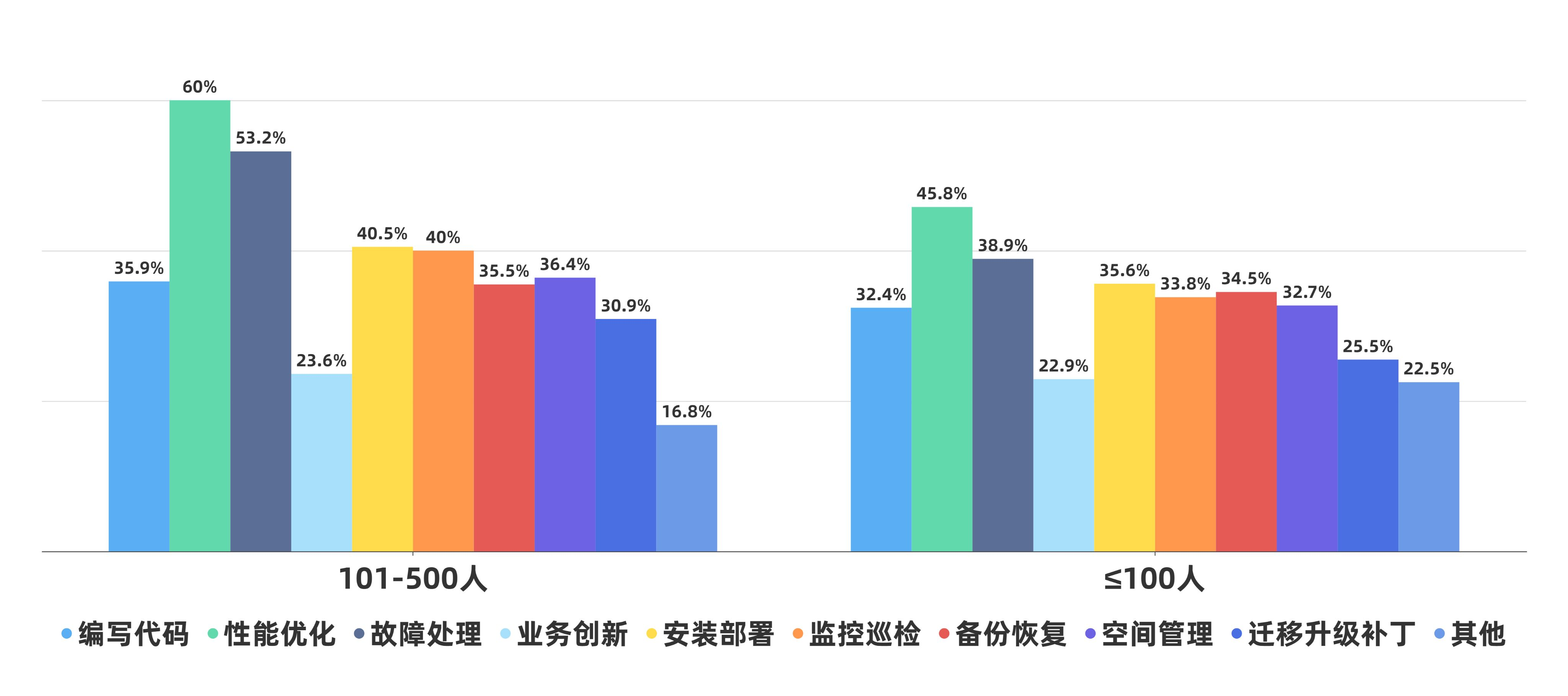 所在企业员工人数为101-500人的受访者,其中从业者在安装部署上花费的时间仍占比40.5%,这说明安装部署的配套工具有待进一步完善并推广。