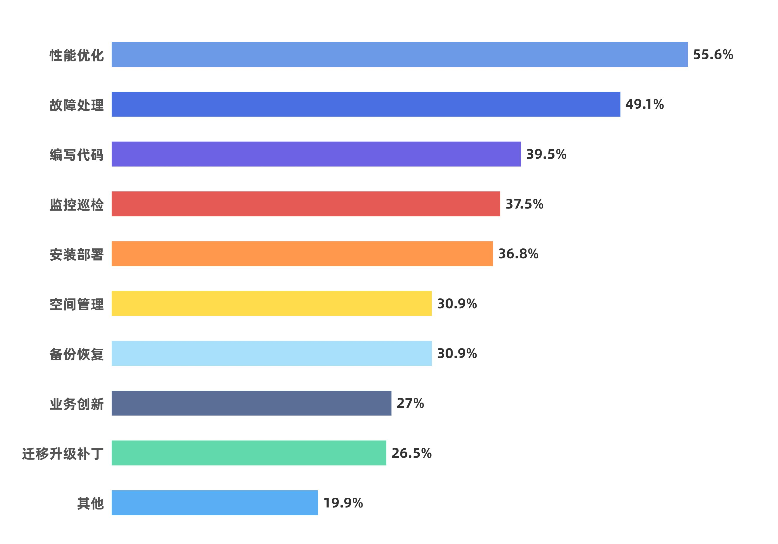 - 性能优化、故障处理、监控巡检是数据库管理员花费时间最多的三个事项