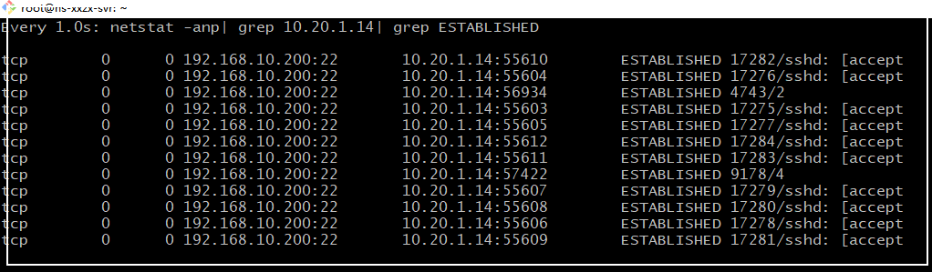 客户端在发起 connect() 连接请求后,并没有任何数据交互,而服务器会处于等待状态,当超时后会释放连接。在服务端可以看到后台的会话数并没有达到预期的 1000。统计处于 ESTABLISHED 状态的 ssh 会话数,发现只有100个左右。