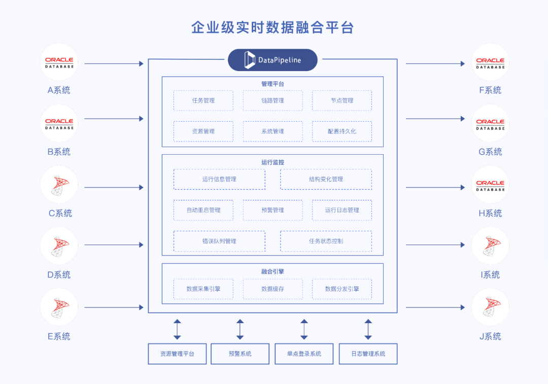 DataPipeline企业级实时数据融合在数据交付效率、降低数据系统耦合度、减轻数据源端压力等方面较之前有很大提升。通过可视化管理页面和配置式构建数据链路,平台可统一监控数据流、数据节点、系统资源等,提升数据链路管理能力,实现数据不一致的及时修复,降低运维难度。该平台具备“数据全、传输快、强协同、更敏捷、极稳定、易维护”六大突出特性: