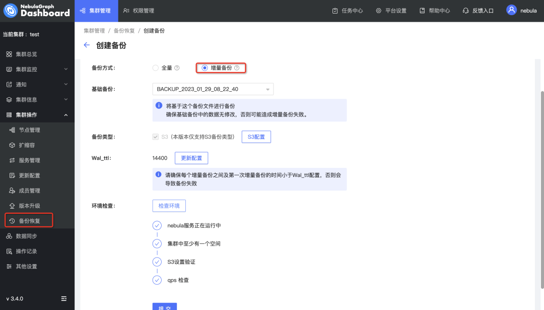 支持增量备份:用户可以基于已存在的备份文件,进行增量备份;