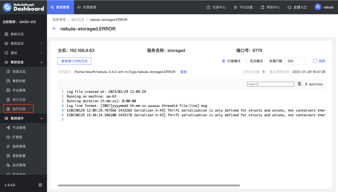 支持查看 NebulaGraph 运行日志:当系统出现故障时,DBA 或开发人员可以根据运行日志定位问题;