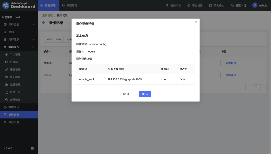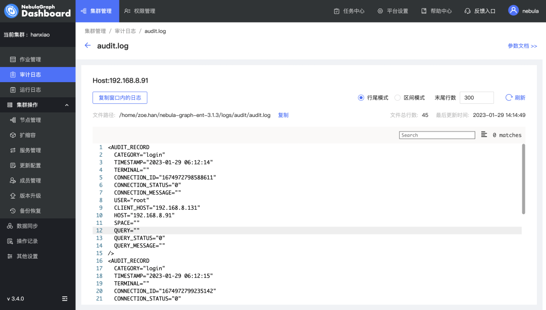 支持查看 NebulaGraph 审计日志:审计日志功能可以将 graph 服务接受到的所有操作进行分类存储,用户通过 Dashboard 可以快速查看审计日志;