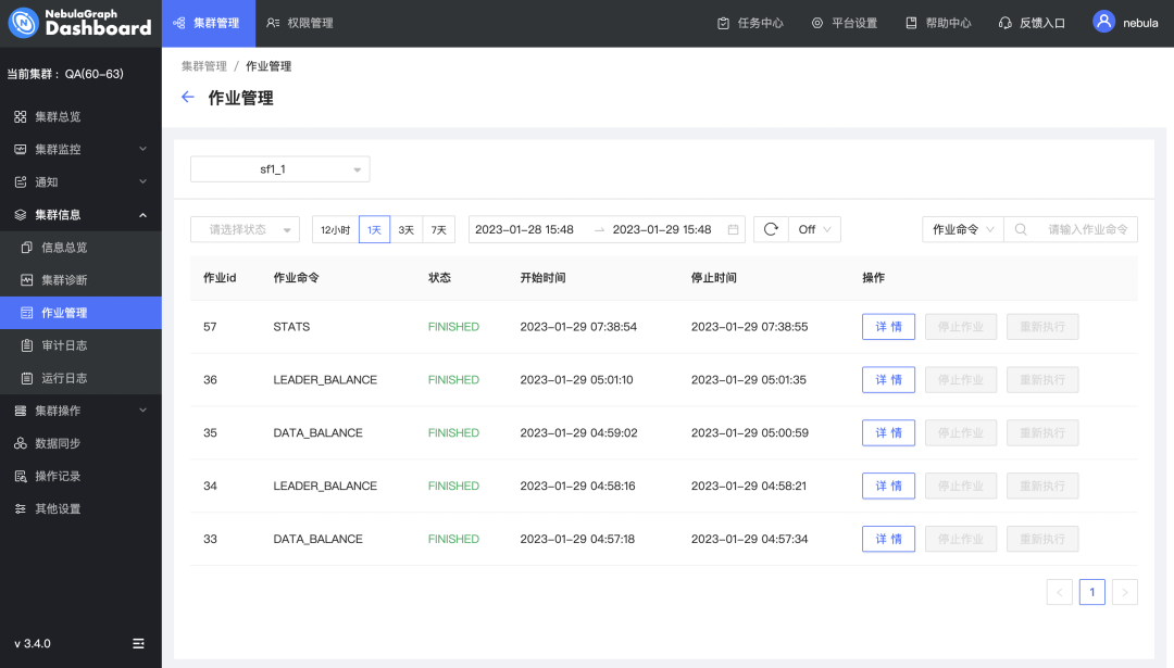支持作业管理:可管理指定图空间中的作业,包括:查看、停止、恢复图空间内的作业,并支持查看单个作业的详情;