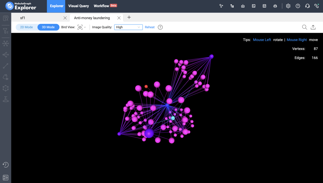 一款可以通过 Web 访问的可视化图探索工具。基于 NebulaGraph 内核与图数据进行可视化交互,NebulaGraph Explorer 支持从复杂关系和大量数据中快速查找友邻关系、分析可疑目标、执行图计算分析,并以可视化的方式展示图数据。