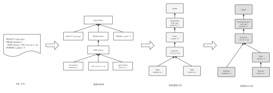 改写后的 SQL,在 INNER JOIN 运算前就完成了过滤运算。这样参与 JOIN 运算的数据量会更少,查询效率也会更快。这个改写是等价的,因为 JOIN 后的结果只保留五年级的数据,那非五年级的数据是没有必要参与 JOIN 运算的。优化器主要工作就是在保证等价的前提下,尽可能让查询更快执行。它的主要流程如下: