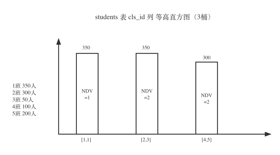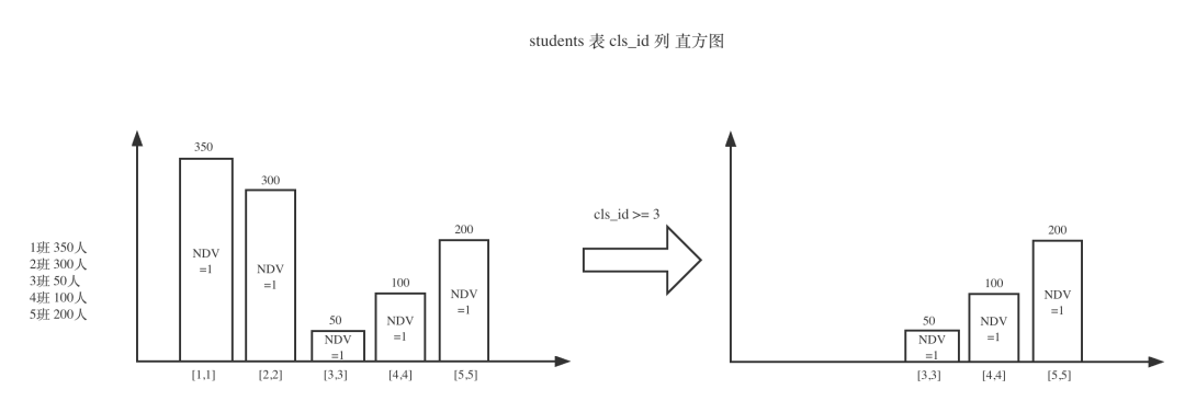 这个例子要用到的统计信息是 NDV (The Number of Distinct Values),然后还有一个均匀假设(Uniformity Assumption)。假设学生有1000人,班级有5个,班级人数均匀分布。