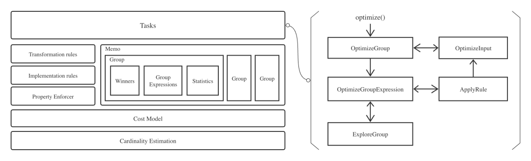 搜索方向从 bottom-up 变成 top-down,有更多裁剪机会,效率更高 分层搜索(先搜逻辑再搜物理)到统一搜索(逻辑和物理混着一起搜),能更早触发裁剪,效率高 框架对优化器工作进行高度抽象后,可并行搜索,扩展性也更强