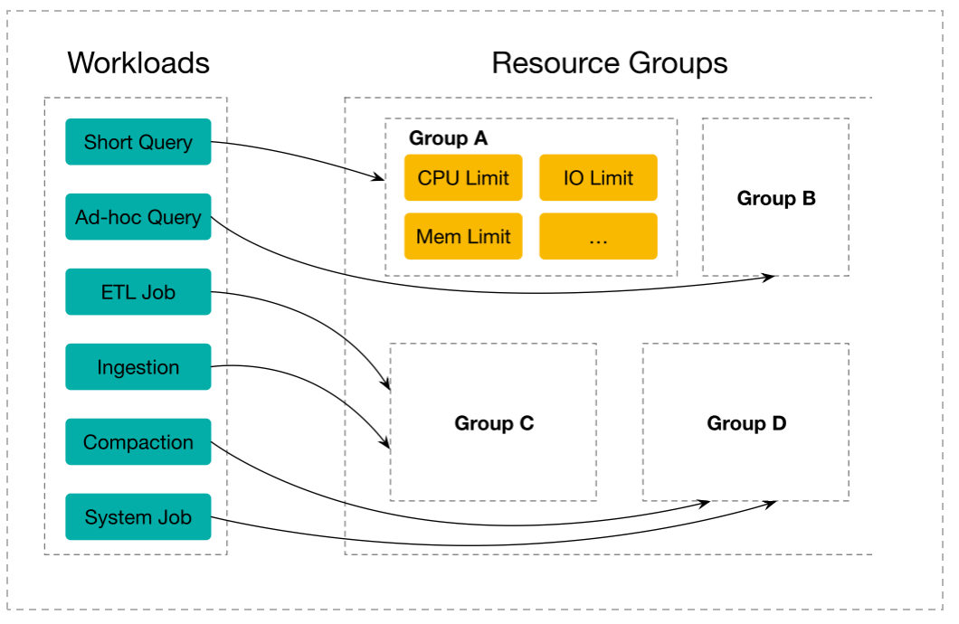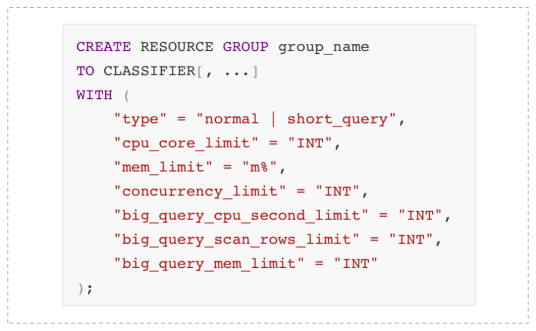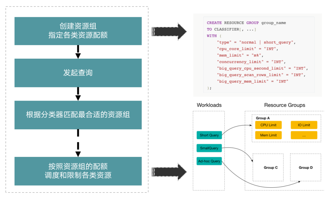 以上就是对于资源组合分类器的定义以及各类资源隔离的功能。总的来说,对于使用资源隔离,首先要创建资源组和分类器,来指定各类的资源配额,并且指定匹配的租户以及工作负载类型。当发起一个查询后,会根据分类器来匹配到最合适的资源组,每个节点会按照资源组的资源配额来调度 CPU 和 IO 资源,并且限制内存和并发资源,同时检查是否需要熔断。