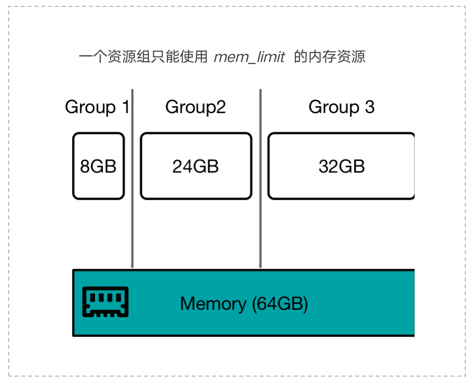 首先,优先选择有 DB 条件的分类器,如果有n个或者0个有 DB 条件的分类器,则会优先选择条件数量最多的分类器。如果有多个条件数量相等的分类器,则会选择条件最精确的分类器。以上图为例,分类器A到D的优先级会逐渐升高,其中它们是否有 DB 条件、条件的数量、条件的精确程度都有所不同。在定义了资源组和分类器以后,就可以实施各项资源隔离的功能了。内存资源的硬隔离,即一个资源组只能使用 memory limit 的内存资源。当该资源组使用的内存资源超限以后,那么该资源组内的查询会返回失败的状态。