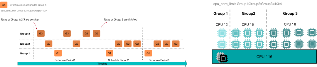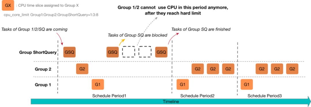 以下图为例,三个资源组会按照1:3:4的比例来使用所有16核的 CPU 资源,即从逻辑上会分别分配到2核、6核和8核的 CPU ,并且当资源空闲时,正在运行的资源组可以弹性使用更多的资源。当第一个调度周期结束以后,第三个资源组的所有任务都已经完成了,所以在接下来的调度周期2和3中,其他的资源组1和2就可以使用全部的 CPU 资源了,也就是每个周期可以分配到更多的时间片。CPU 资源的软隔离的方式会存在少量的调度延时,所以对于高优先级的点查这一类对调度延迟很敏感的极端的场景,我们提供了短查询资源组的功能。当有短查询资源组的查询时,会为其保留 cpu_core_limit 的 CPU 资源,其他资源组只能使用剩余的 CPU 资源。