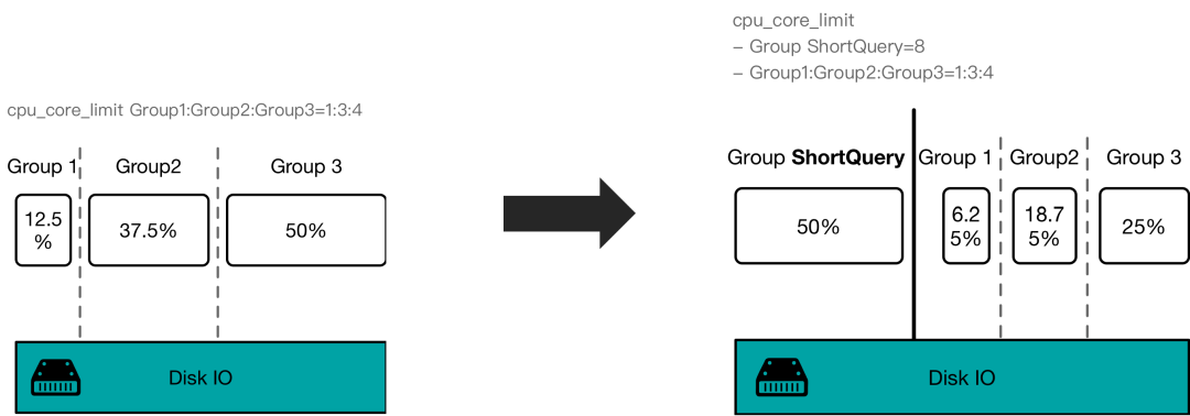 当有短查询资源组的任务时,其余的资源组在每个周期只能使用 hard limit 的资源。如果在一个周期内它们使用的资源超过了该阈值上限,则本周期不会再调度它们的任务去执行。但是在同一时刻可能会有多个这些资源组的任务在执行,所以当发现资源超限时,它们的资源用量可能已经超过很多了。因此,我们添加了惩罚策略来保证在总体上,对于这些资源组的硬隔离:如果在本周期,它们的资源用量在一倍 hard limit 到两倍 hard limit 之间,那么会将它的下一个周期的资源用量初始值赋值为当前用量减去 hard limit ,也就是在下个周期可以使用少量的资源。而如果当前用量在两倍 hard limit 以上,那么会将它下个周期的资源用量初始值赋值为 hard limit ,即下个周期无法调度它们的任务去执行。