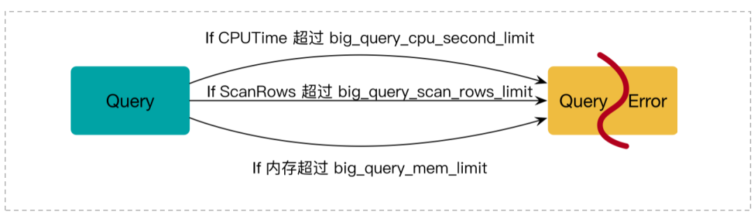 当一个查询使用的 CPU 时间、IO 扫描的行数以及内存资源超过阈值时,大查询会直接被熔断,返回失败的状态。