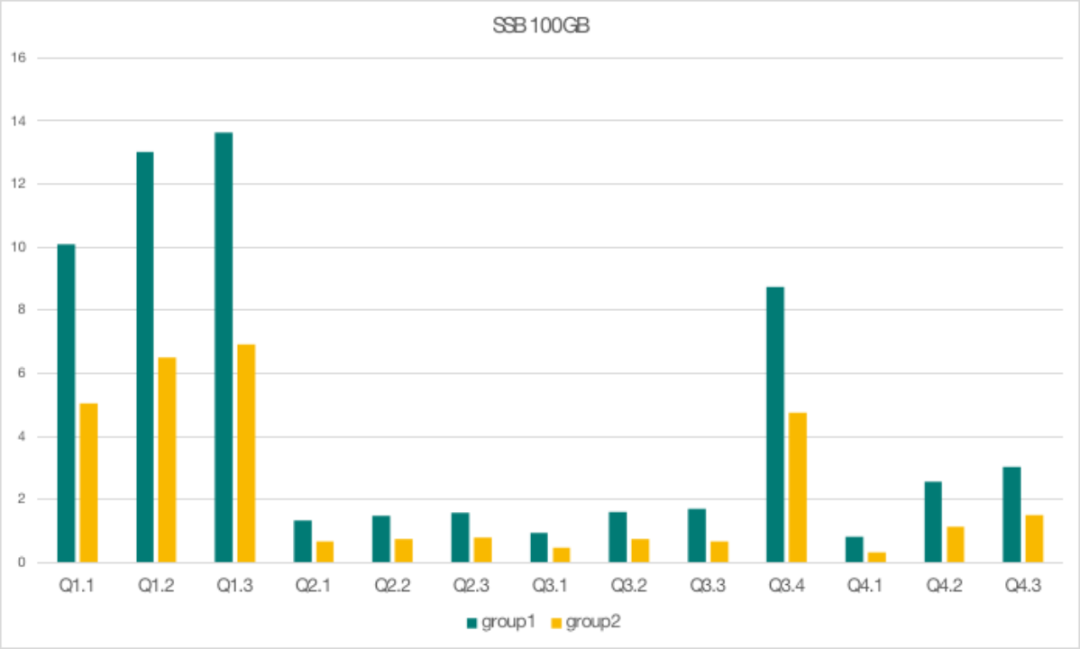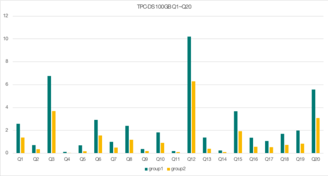 下面图中是 SSB 100GB 的测试结果,可以看到每一个查询的 QPS 都符合了2:1的比例。接下来是TBC-DS 100GB 前20个 query 的测试结果,每一个查询也基本符合了2:1的 QPS 比例,这说明对于不同资源组运行相同负载的测试,两个资源组可以按照比例使用资源将资源隔离开。在实际使用中,大小查询混合的工作负载模式会更加常见。所以我们也进行了这一类的测试。
