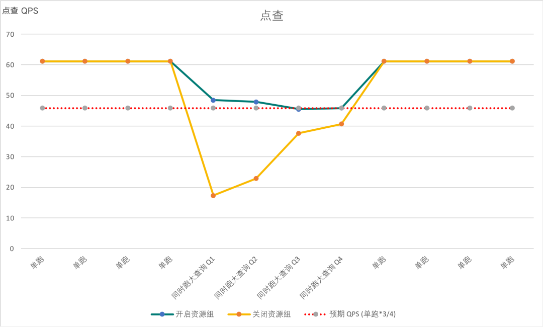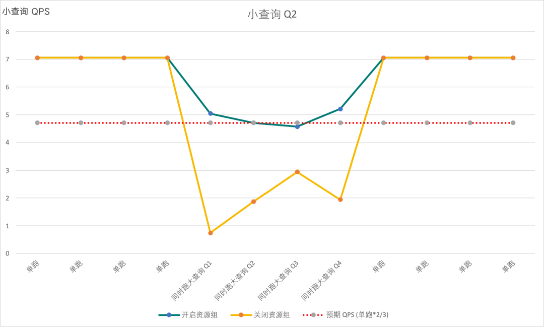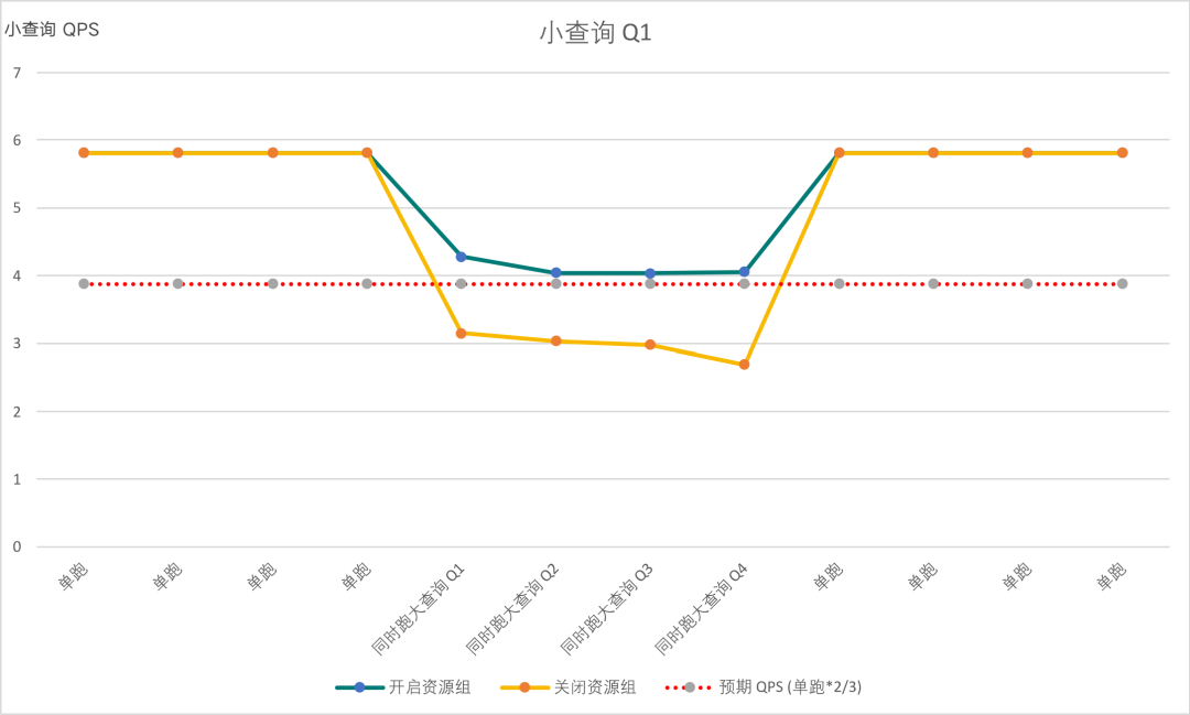 本次依旧使用两个资源组,其 cpu_core_limit 之比为 2:1,第一个资源组运行8并发的小查询,第二个资源组运行4并发的大查询。我们期望与大查询混跑的小查询的 QPS 与单独跑的 QPS 之比为2:3,来说明该资源组使用了2/3的资源,没有受到另外一个资源组的大查询的影响。其中对于小查询和大查询,我们都提供了各种类型的查询进行测试。下图是第一个小查询的测试结果,其中黄色的折线是关闭资源组的测试结果,蓝色的折线是打开资源组的测试结果。而在两条虚线中间的部分是与大查询混跑的小查询的 QPS ,可以看到混跑的小查询的 QPS 与单跑的小查询的 QPS 之比符合2:3的比例。接下来是第二个小查询的测试结果,可以看到也基本符合2:3的比例。这说明对于大小查询的测试,运行小查询的资源组没有受到另外一个运行大查询资源组的影响,可以将资源隔离开。对于高优先级的很短的点查询,我们提供了短查询资源组的功能,并且进行了相应的测试。短查询资源组与另外一个资源组的 cpu_core_limit 之比为 3:1,短查询资源组运行8并发的点查询,另外一个资源组运行4并发的大查询。我们期望与大查询混跑的点查的 QPS 与单独跑的 QPS 之比为3:4,来说明短查询资源组使用了3/4的资源。下图是具体的测试结果:与大查询混跑的点查的 QPS 与单独跑的 QPS 之比基本符合3:4的比例,这说明可以为短查询资源组预留3/4的资源。—