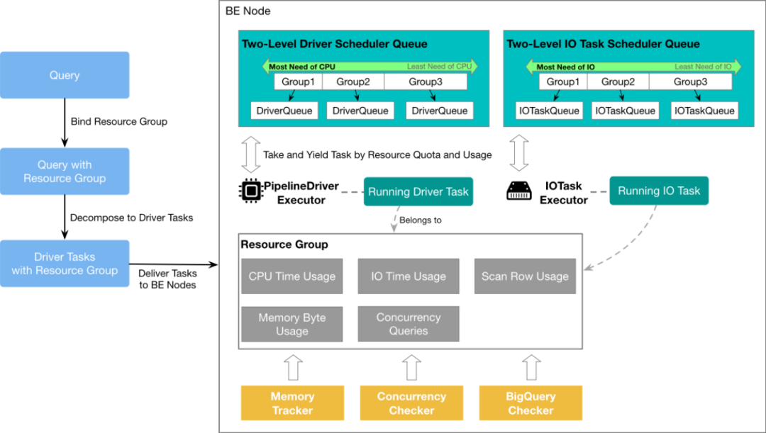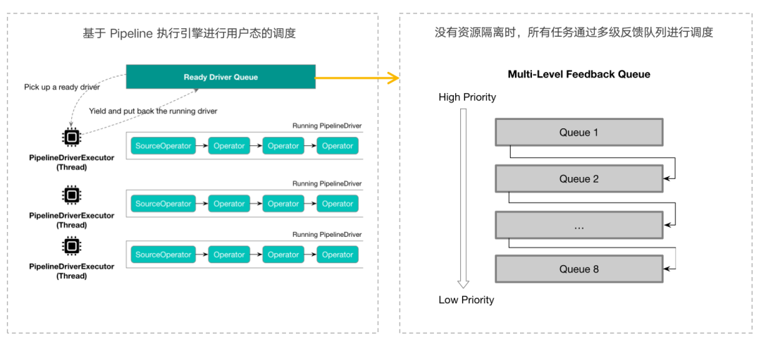 对于 CPU 和 IO 资源的软隔离是基于 StarRocks 的 pipeline 执行引擎实现的:pipeline 执行引擎会将所有查询的执行单元的任务在用户态进行调度。
