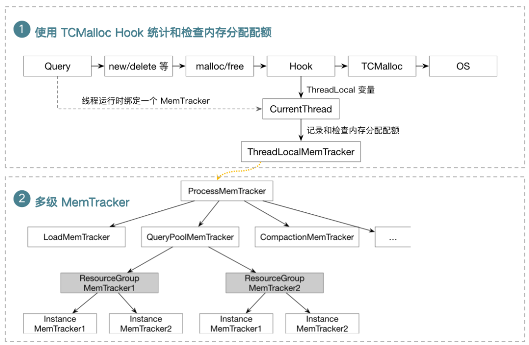 对于内存资源的硬限制,复用了 StarRocks 已经提供的对于内存资源统计和检查的功能,使用 TCmalloc 的 Hook 在申请和释放内存时对内存进行统计和检查,在每一个线程运行时会绑定一个 Memory Tracker 到一个 Thread Local 变量。这个 Memory Tracker 就是用来记录和检查内存的,它是一个多级的树结构。其中对于资源隔离来说,会添加每一个资源组的 Memory Track 到树形结构中。