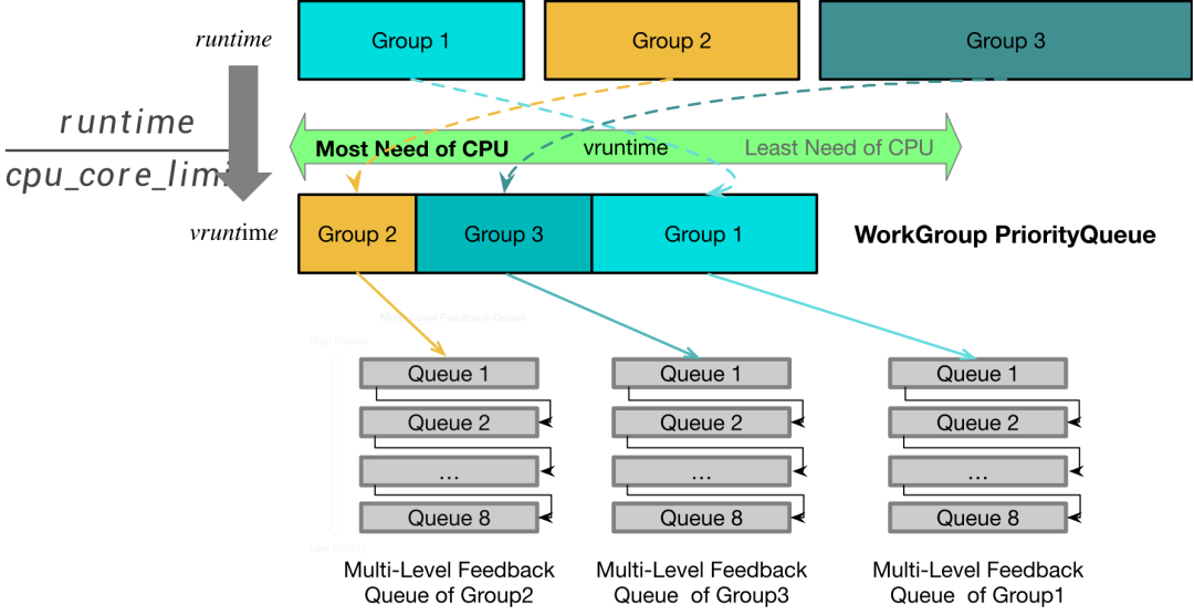 具体来说会有核数个执行线程以及一个查询单元任务的就绪队列。每一个执行线程会从就绪队列中取出合适的任务来执行,并且正在执行的任务会因为时间耗尽或者其他调度因素的影响,及时的让出执行线程并且放回就绪队列,执行校验程再从就绪队列中取出下一个合适的任务来执行。pipeline 执行引擎会将所有查询的执行单元任务在用户态进行调度,因此可以很方便地实行各种不同的调度策略。而当没有资源隔离时,所有任务是通过多级反馈队列进行调度的。当有资源隔离以后,会使用一个两级的队列进行调度,这里与 Linux 进程的完全公平调度算法类似:第一级是资源组的优先级队列,第二级是每个资源组内部的多级反馈队列。每次执行线程在选择合适的任务执行时,会选择当前 Vruntime 最小的资源组的任务来执行,Vruntime 就是将 CPU 执行时间或者 IO 执行时间除以 cpu_core_limit 得到的。通过这种方式可以保证所有资源组按照 cpu_core_limit 的比例来使用 CPU 和 IO 资源。同时为了尽量减小调度延迟,我们会不断地检查当前正在执行任务的 Vruntime 是否还是最小的,如果它不再是最小的,会及时让出 CPU 或者 IO 资源。为了避免频繁地更换任务,会保证一个任务至少执行 5 毫秒之后才让出。此外,如果一个很久没有任务的资源组再次有任务到来时,因为其他的资源组一直在运行,它们的 Vruntime 在持续增加,所以这个资源组的 Vruntime 会相对小很多。为了避免一直调度它的任务去执行,导致其他资源组饥饿,所以会调整它的 Vruntime 为当前最小的资源组的 Vruntime ,并且减去一个常量作为它的奖励。同样,针对高优先级的很短的点查询,我们提供了短查询资源组的功能。