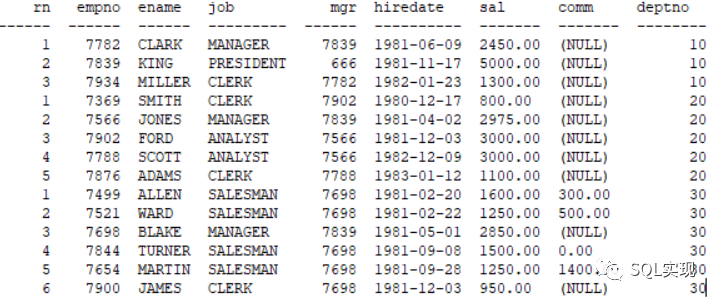 SELECTrn,empno,ename,job,mgr,hiredate,sal,comm,deptnoFROM(SELECT@rn := IF(deptno = @deptno, @rn + 1, 1) AS rn,emp.*,@deptno := deptnoFROMemp,(SELECT@deptno := NULL,@rn := 1) bORDER BY deptno,hiredate) t