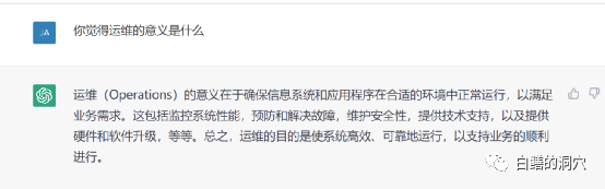 我们回过头来再来看运维的意义,而不过多的纠缠“信息化、数字化的意义”。最近我在写文章时候喜欢问问ChatGPT,这回它的回答和我的想法是基本一致的。运维的意义并不在于更快地发现问题,防患于未然等我们原本认为的事实。这些我们原本认为是运维的意义的东西实际上都是达成“运维的意义”所采取的手段。