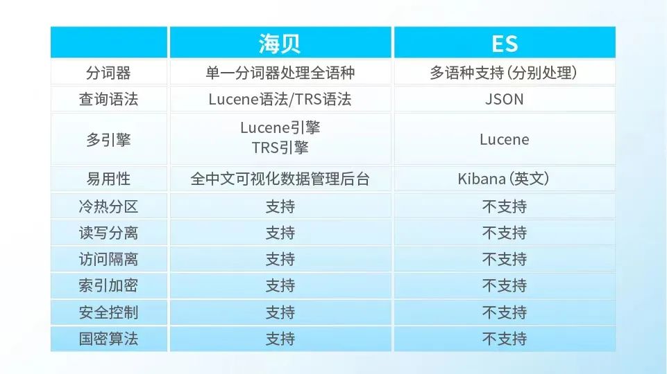 国家市场监督管理总局牵头建设的国家企业信用信息公示系统,是国家级企业信用信息归集公示平台,是政府部门协同监管和联合惩戒的跨部门工作平台,是企业报送并公示年报和即时信息的法定权威平台,是社会公众免费查询使用企业信用信息的操作平台。该系统从项目筹建之初,按照以往的项目经验,广泛采用开源的全文搜索引擎ElasticSearch(以下简称ES),但是由于信创的国家战略,通过优选,选择了纯国产自主研发的拓尔思海贝搜索引擎数据库进行测试对比。通过测试对比,海贝在数据安全、综合能力和生态兼容等方面要优于ES,尤其是在搜索能力方面,相较于以Lucene为引擎的ES,海贝基于一个纯C内核的TRS引擎,系统资源的使用更加合理可控,复杂搜索响应性能更优,不会出现因为数据索引、超长表达式检索、通配符检索等操作导致系统进入长时间FullGC而无法响应的情况。海贝提供了更加专业的段、句、位检索、XML检索,支持度量衡数据的数值区间检索等高级功能。具体功能对比如下: