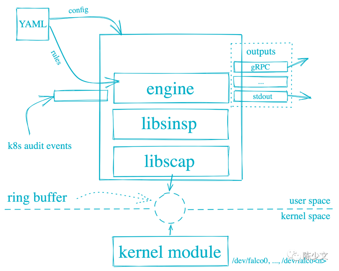 Falco 实现了一套可扩展的事件规则过滤引擎,通过获取事件、匹配安全规则、产生告警通知系列操作,能够发现系统中的安全问题。其中的事件来自系统调用,同时也支持 ebpf 探针,规则是开源的[1],可以自行定义扩展[2]。下图为其架构图: