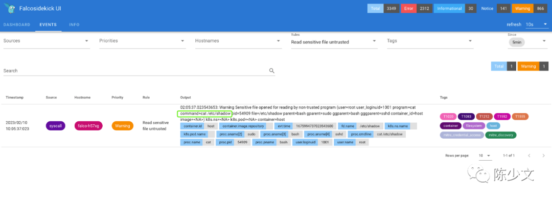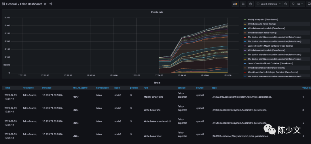 ,得到结果 falco_events{app_kubernetes_io_instance="falco-exporter", app_kubernetes_io_managed_by="Helm", app_kubernetes_io_name="falco-exporter", app_kubernetes_io_version="0.8.0", helm_sh_chart="falco-exporter-0.9.1", hostname="falco-h57xg", instance="1.1.1.1:9376", job="kubernetes-service-endpoints", k8s_ns_name="<NA>", k8s_pod_name="<NA>", namespace="falco", node="node1", priority="4", rule="Read sensitive file untrusted", service="falco-exporter", source="syscall", tags=",T1020,T1083,T1212,T1552,T1555,container,filesystem,host,mitre_credential_access,mitre_discovery,"}