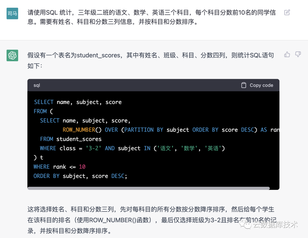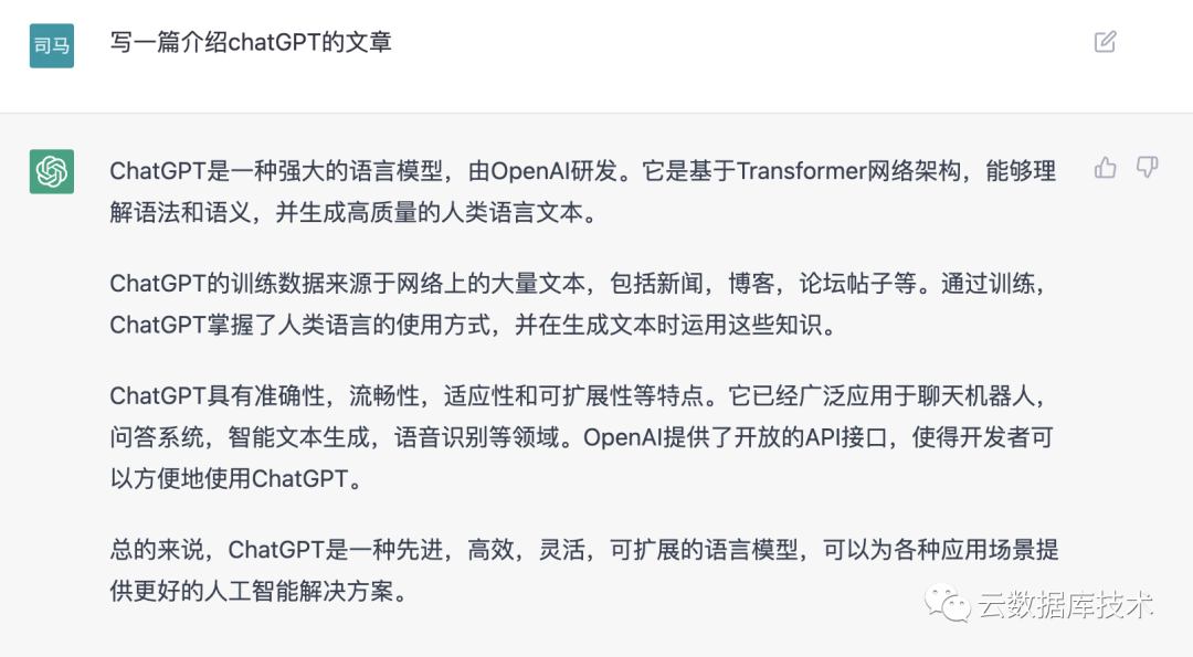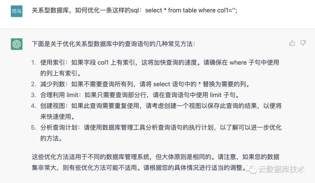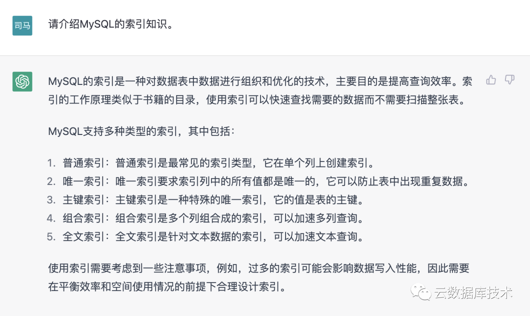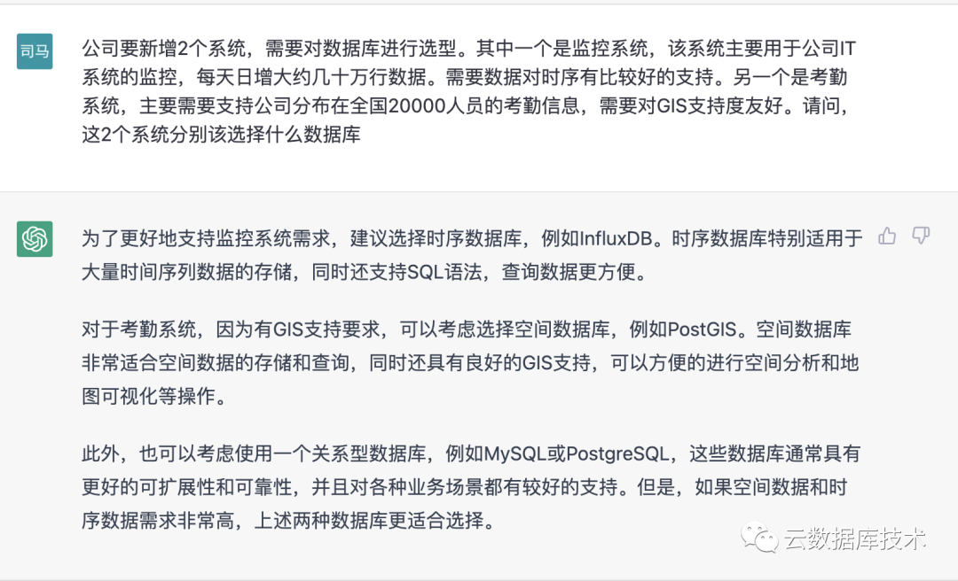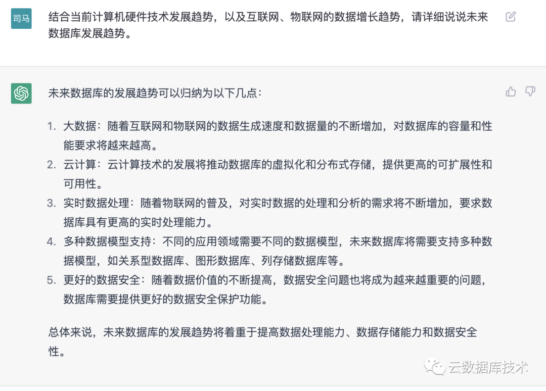 最近,ChatGPT火爆全网,介绍其产品、公司、作者、技术和应用等方面信息,占据着整个互联网,似乎不谈GPT好像就落伍了。作为一个关注数据库行业的公众号,我们问了GPT几个数据库问题,结果让人大跌眼镜,不管是从SQL编写、SQL优化、数据库选型、表设计、理论认识、行业认识都有比较高质量的回答。