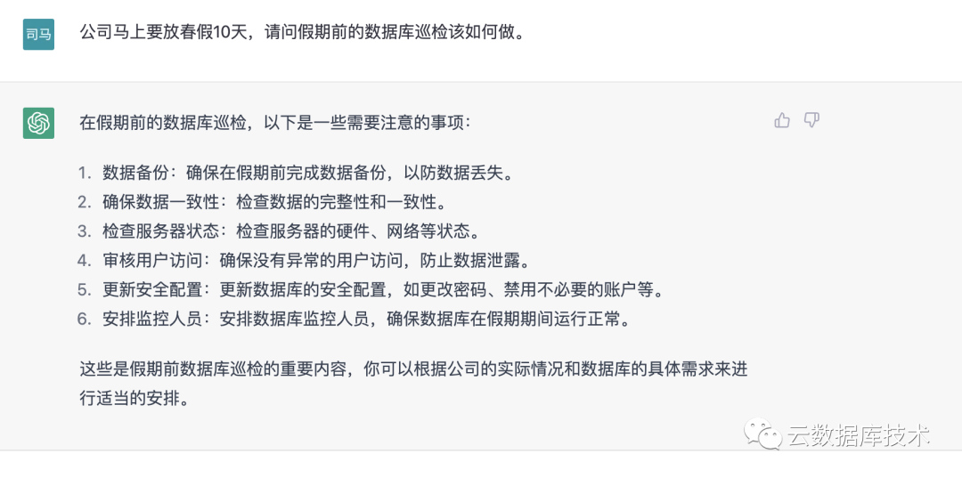 从上面测试可以看到GPT在SQL编写、SQL优化、数据库选型、数据库巡检、数据库理论、数据库发展上都有比较惊艳的表现,它不仅能完全理解提问者的意思,而且大部分问题都给出了高质量的回答。不论这些问题是提供解决方案方面,还是需要给出最佳实践的方案。几年前,数据库行业出现数据库自治服务,比如国外的Oracle自动驾驶、国内阿里云的DAS,未来结合GPT类似产品,可能数据库完全自治服务将不远了。