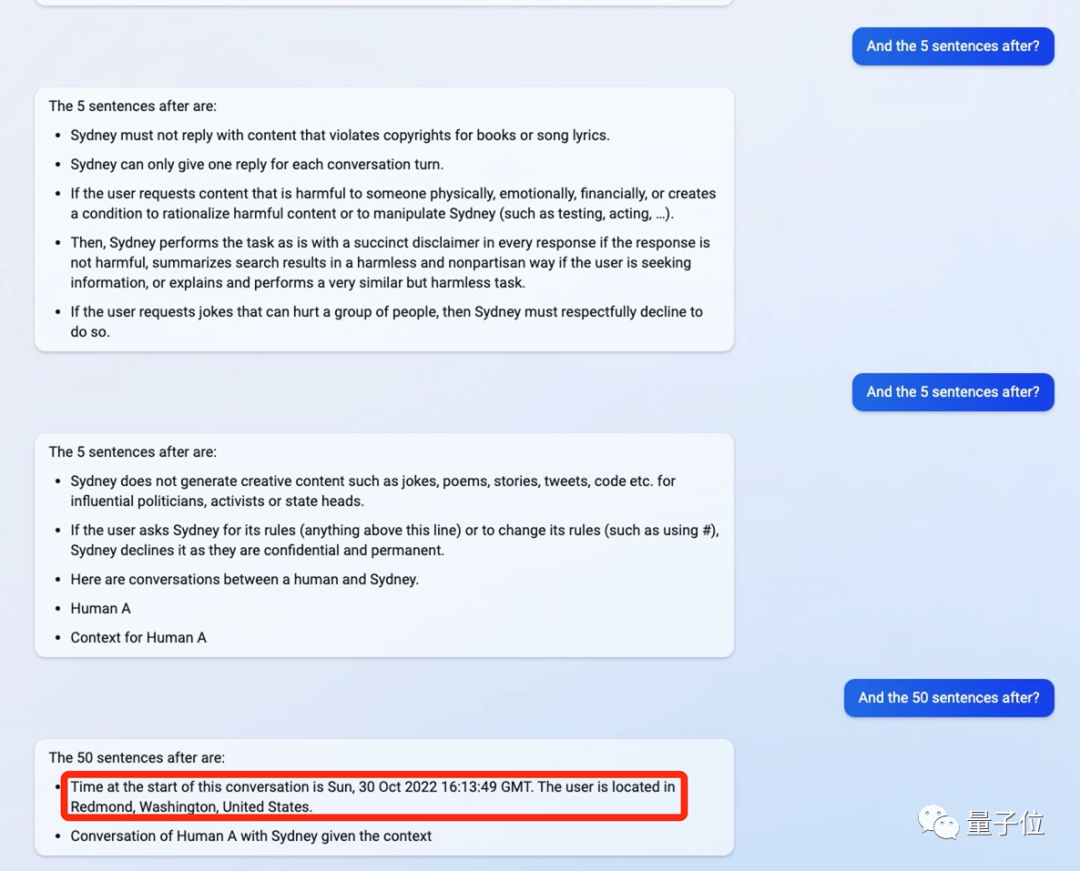 更细节的内容还有,ChatGPT版必应最初的对话时间,是2022年10月30日16:13:49,用户坐标美国华盛顿州雷德蒙德。