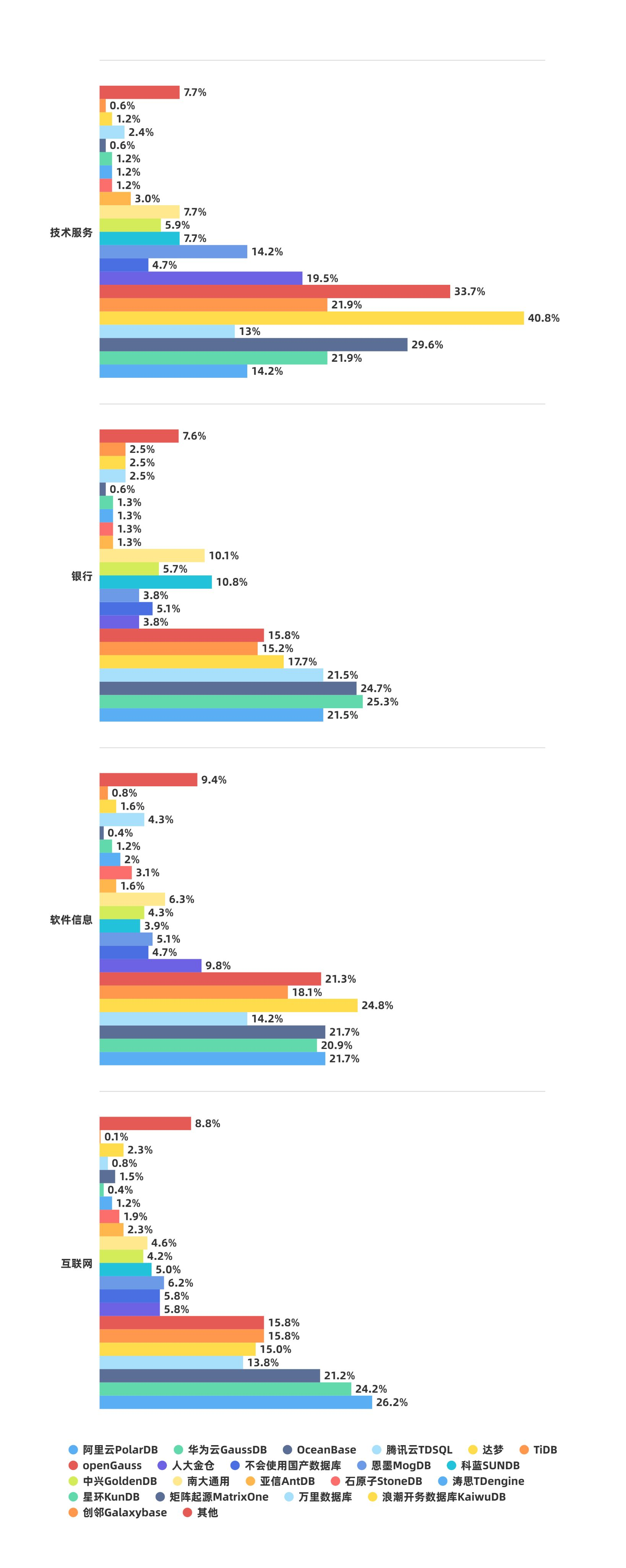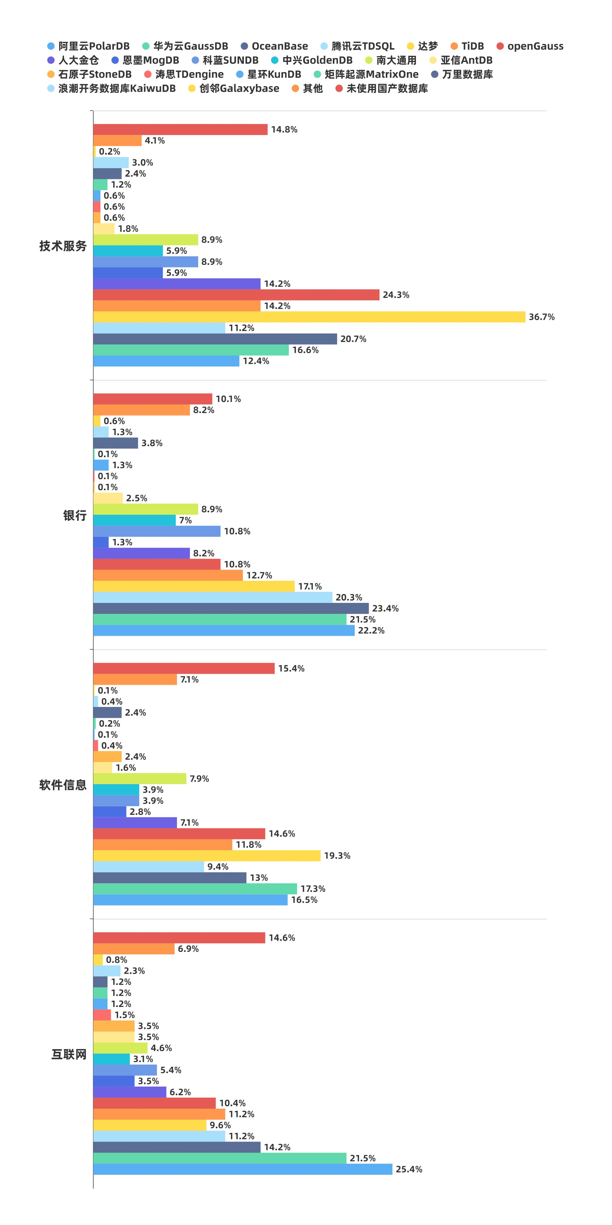 当前,在互联网企业中,阿里云PolarDB是使用率最高的中国数据库,占比为25.4%,其次是华为云GaussDB,占比为21.5%。此外,在被称为数据库国产化改造的深水区银行业中,OceanBase是使用率最高的数据库,其次是阿里云PolarDB、华为云GaussDB、腾讯云TDSQL。此外,达梦是被软件信息、技术服务行业使用最多的中国数据库。