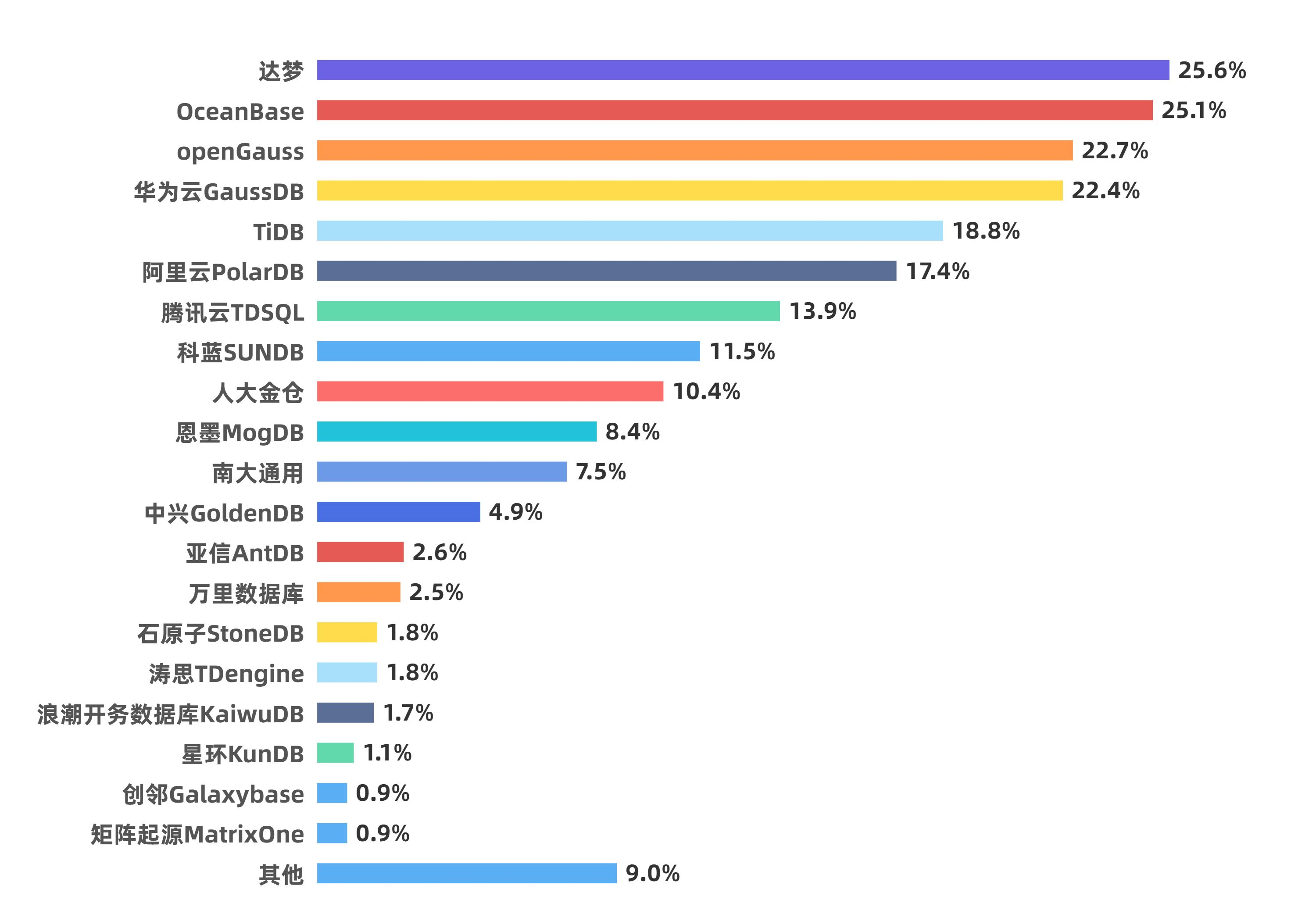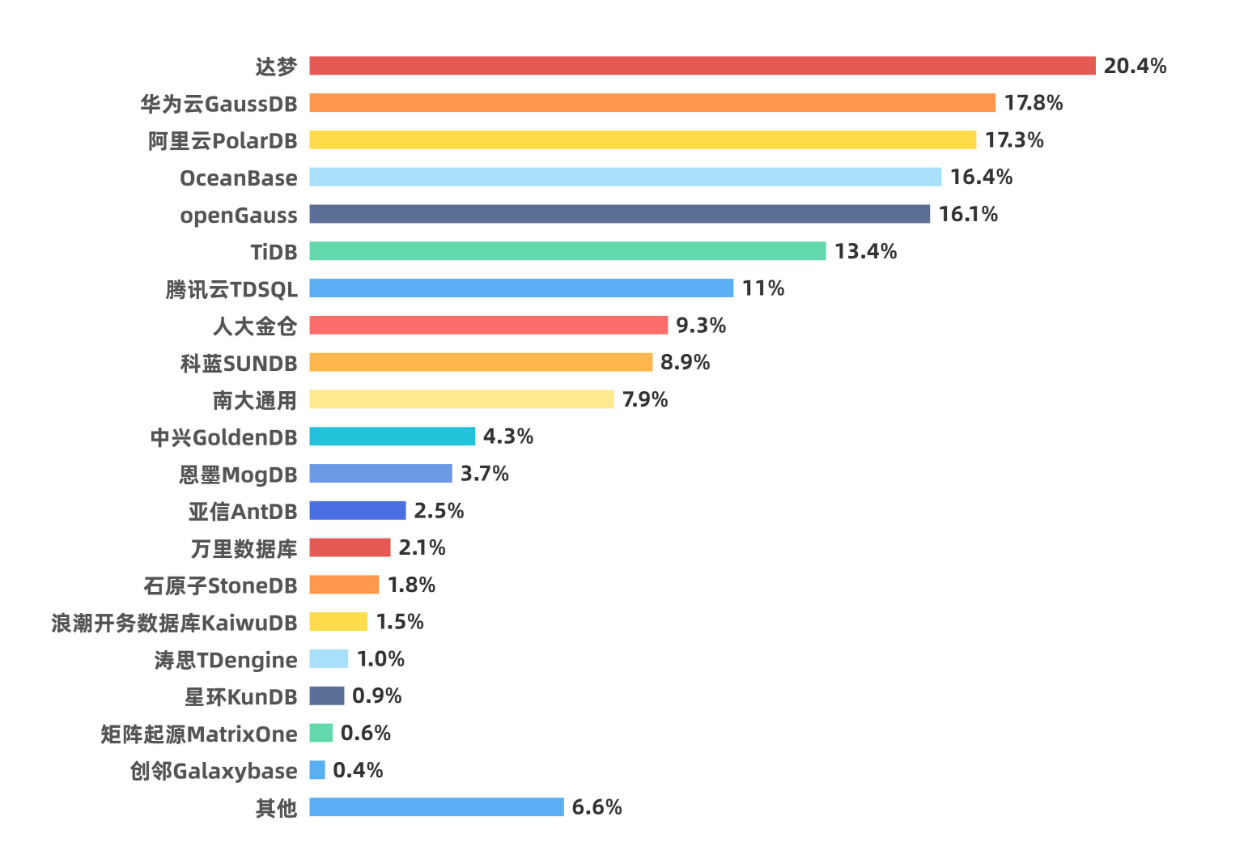 达梦数据库是企业使用率第一的中国数据库,占比达20.4%;华为云 GaussDB、阿里云 PolarDB 分别以17.8%、17.3%的占比紧随其后。其后分别是 OceanBase、openGauss、TiDB、腾讯云TDSQL、人大金仓、科蓝SUNDB、南大通用,这与墨天轮榜单前十大致保持着一致。