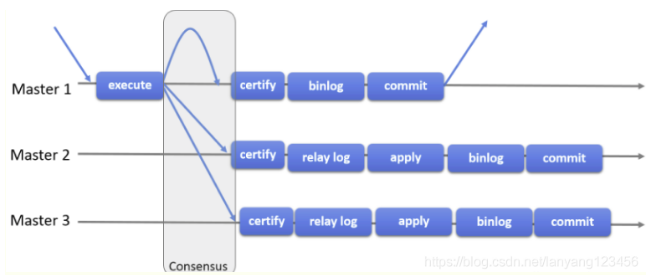执行完成之后,在发起事务的提交之前,会将产生的write set广播到其他节点,集群中节点进行冲突检测。