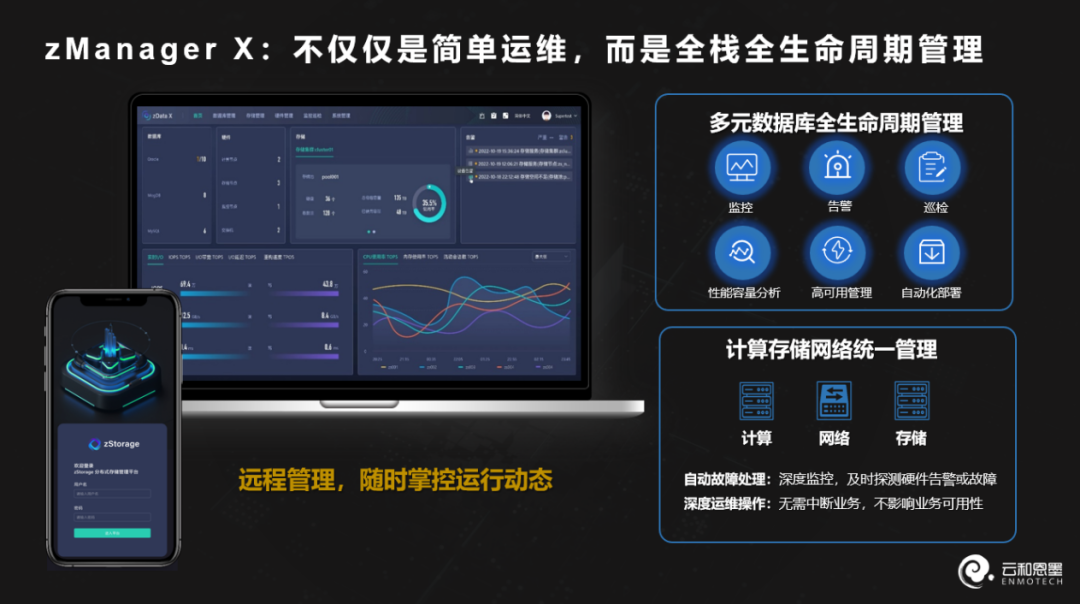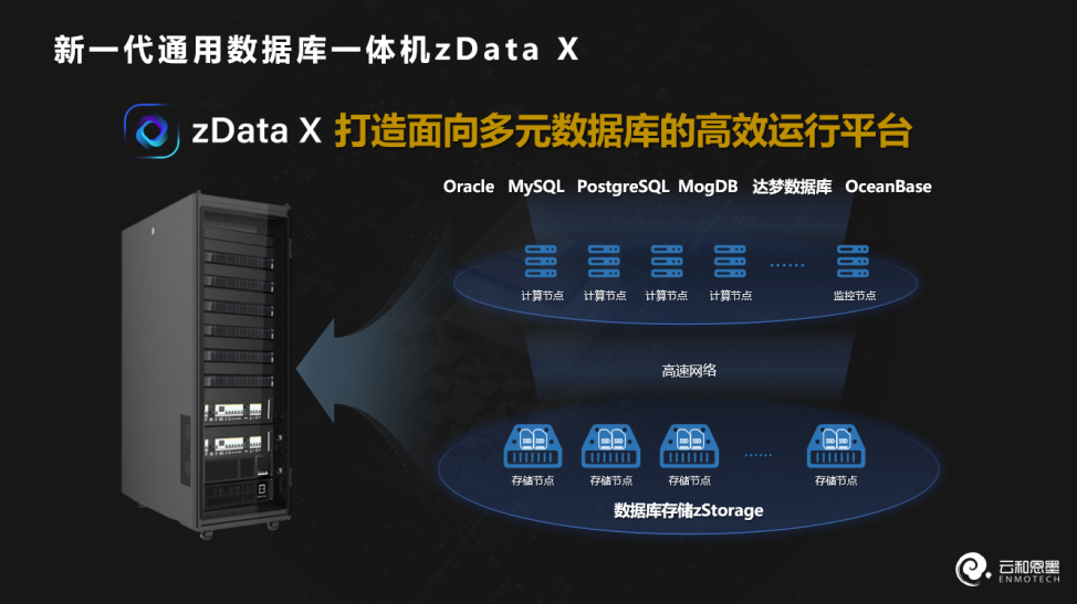 对于这个问题,云和恩墨认为“应围绕多元数据库这一中心,向上提升全栈全生命周期管理能力,向下进行软硬件的深度优化”。基于自研的新一代数据库存储 zStorage 的数据库一体机 zData X 就此诞生,并在今年1月12日召开的“多元共生,智创未来——2023云和恩墨生态产品发布会”上正式亮相。