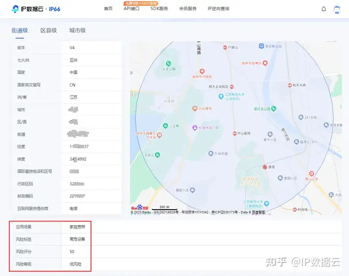 如果你想要免费的IPv4归属地API接口查询服务,页面上方点击“API接口”可以免费领取1000次/日的查询次数。